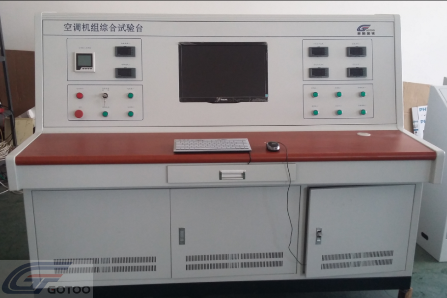 The test device consists of an air conditioning unit test bench, electrical measurement and control cabinets and electrical connection lines, including: temperature sensor, electrical parameter measuring instrument, wind speed tester, phase sequence protector, AC contact, overheat protector, air switch, operation Buttons, controllers, electrical connectors, cables and cabinets, air heaters, and computer test systems.